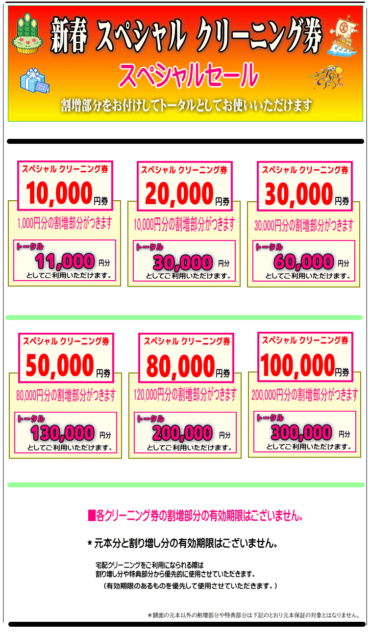 ■本クリーニング券は他のクリーニング券や回数券、無料券と併用出来ます。